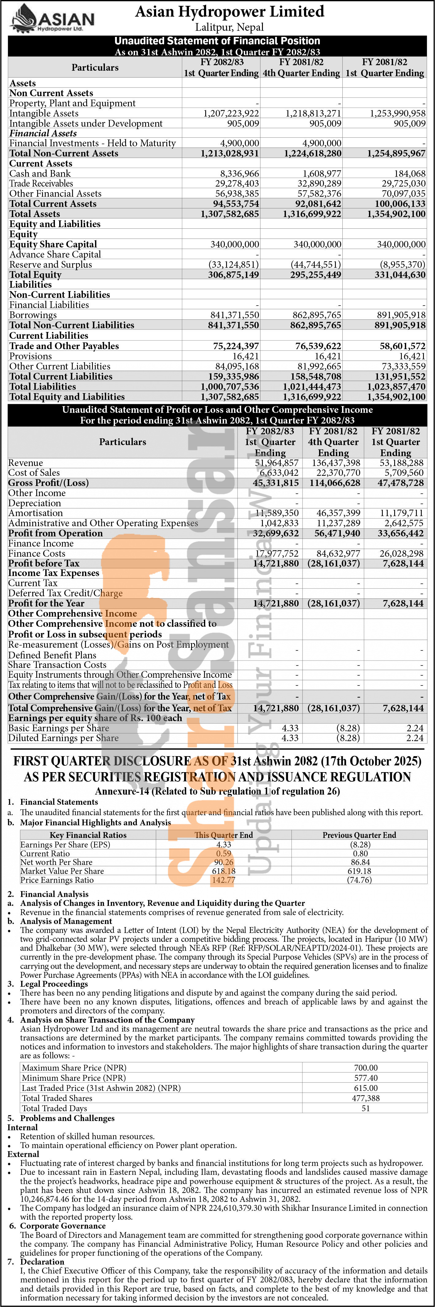 Asian Hydropower Limited has posted a net profit of Rs 14.72 million and published its 1st quarter company analysis of the fiscal year 2082/83.