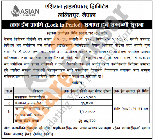 Asian Hydropower Limited has published a notice regarding the expiration of the lock-in period for its promoters, local residents of the project affected area and employee shares on 13th Falgun, 2082.