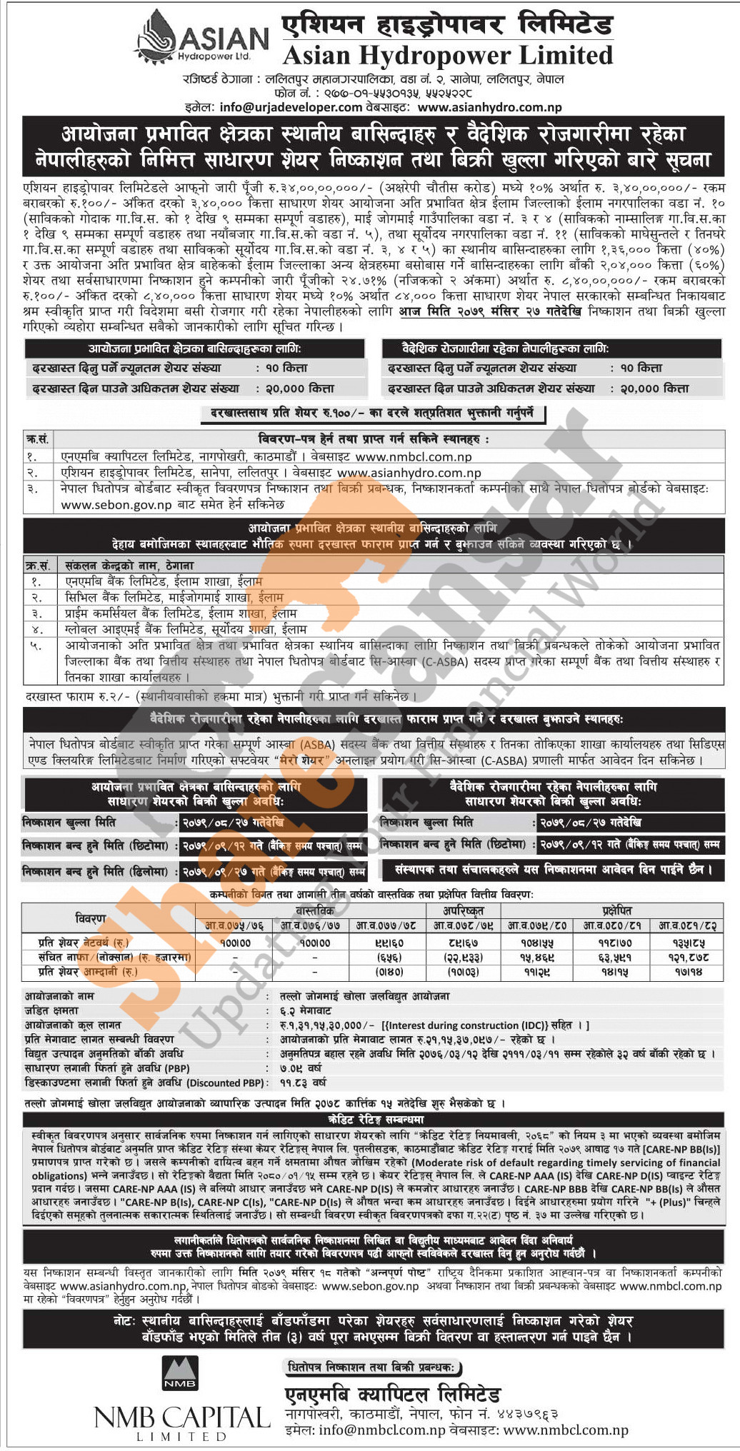 Asian Hydropower Limited is opening 3,40,000 units IPO shares to the project affected locals of Ilam District and 84,000 units IPO Shares to Foreign Nepalese Employees from today (27th Mangsir, 2079).