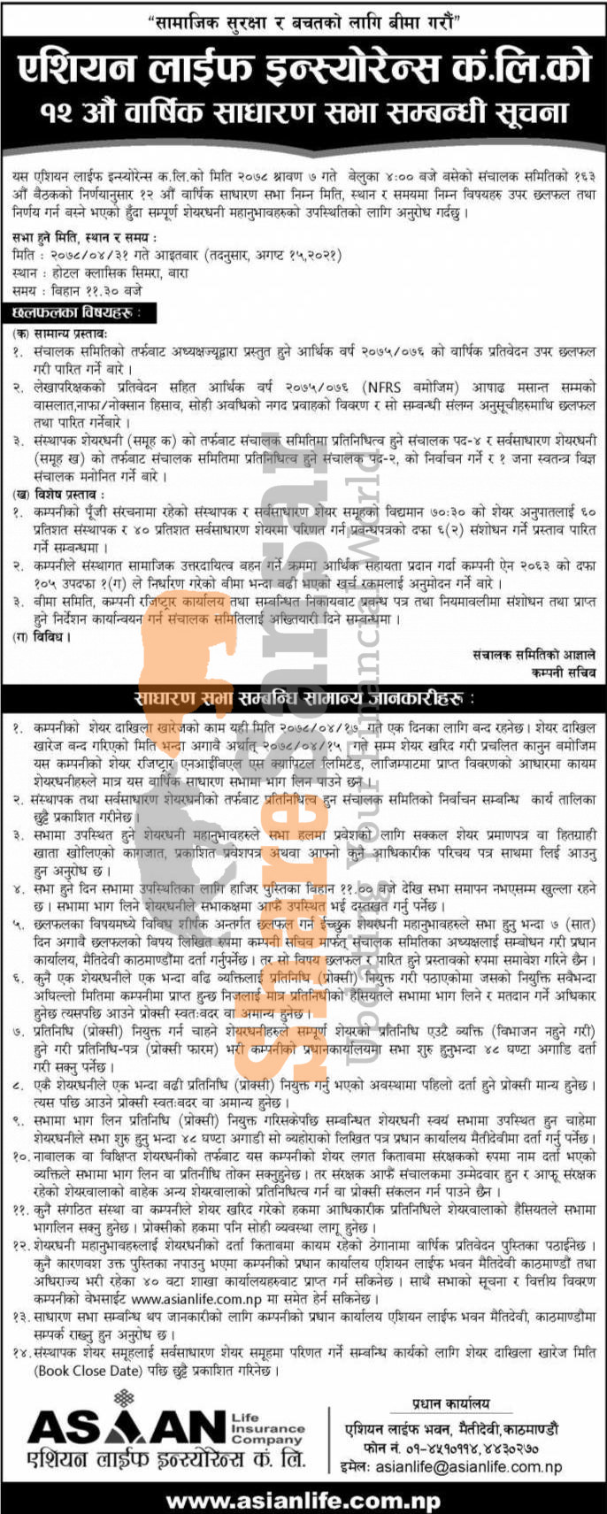 Asian Life Insurance Company Limited has announced its 12th AGM going to be held on 31st Shrawan, 2078.