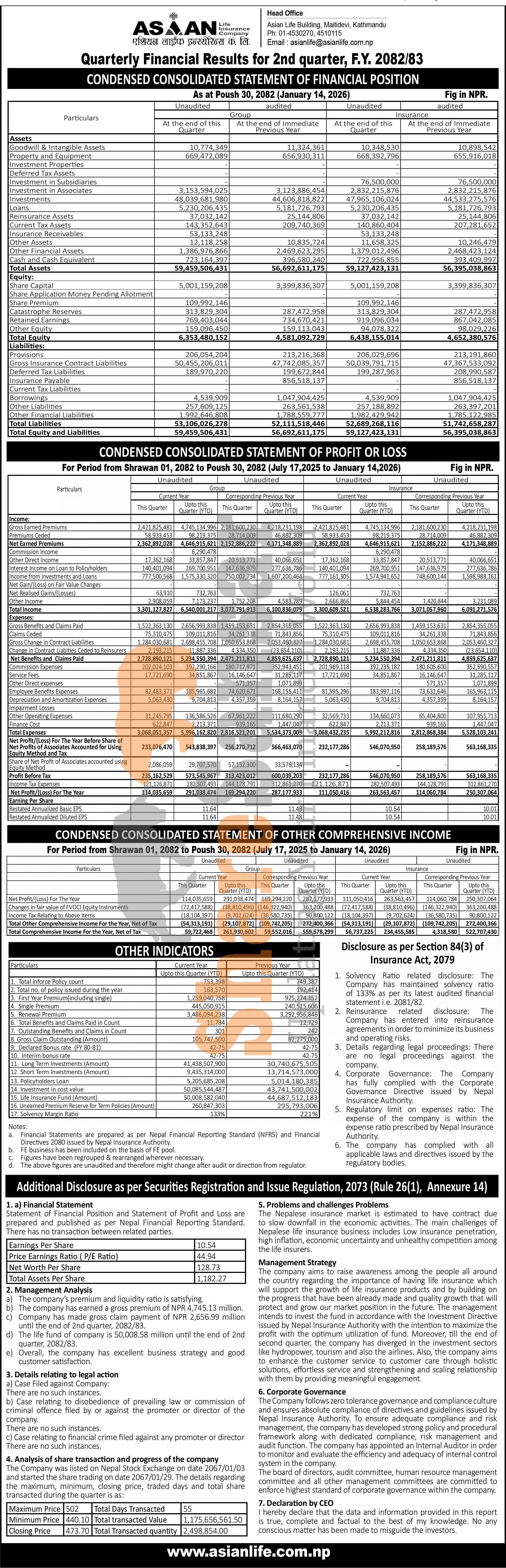 Asian Life Insurance Company Limited has posted a net profit of Rs 263.56 million and published its 2nd quarter company analysis of the fiscal year 2082/83.