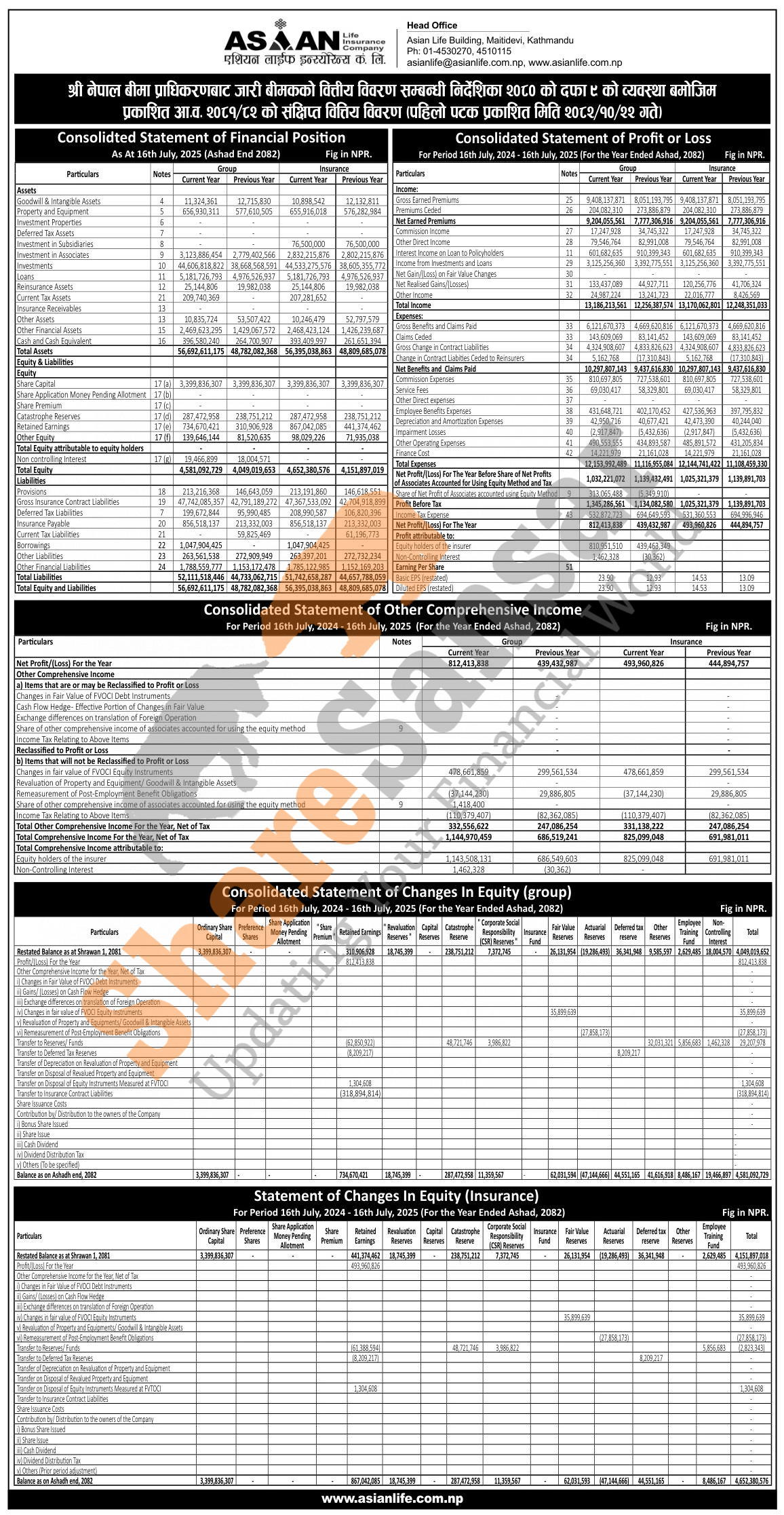 Asian Life Insurance Company Limited has published its annual financial statement of the fiscal year 2081/82 issued by Nepal Insurance Authority.