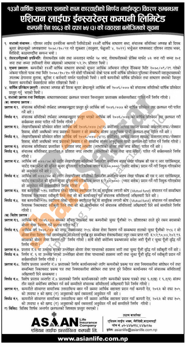 Asian Life Insurance Company Limited has published the minutes of its 13th AGM.