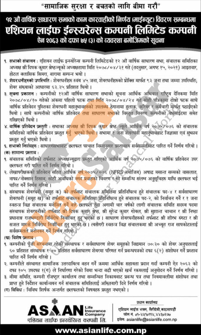 Asian Life Insurance Company Limited has published the minutes of its 12th AGM.