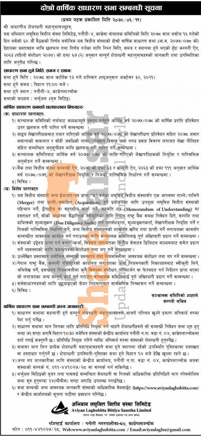Aviyan Laghubitta Bittiya Sanstha Limited has announced its 2nd AGM going to be held on 13th Kartik, 2078.