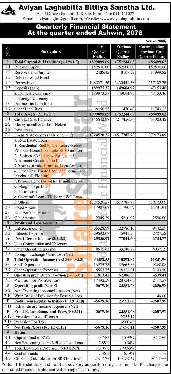 Aviyan Laghubitta Bittiya Sanstha Limited has posted a net loss of Rs 5.67 million during the 1st quarter of the fiscal year 2078/79.