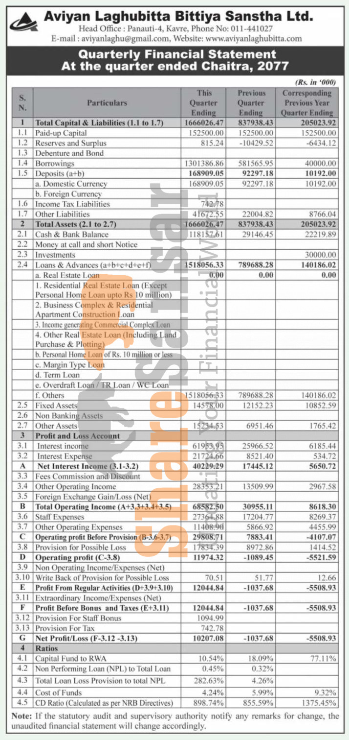 Aviyan Laghubitta Bittiya Sanstha Limited has posted a net profit of Rs 10.20 million and published its 3rd quarter company analysis of the fiscal year 2077/78.