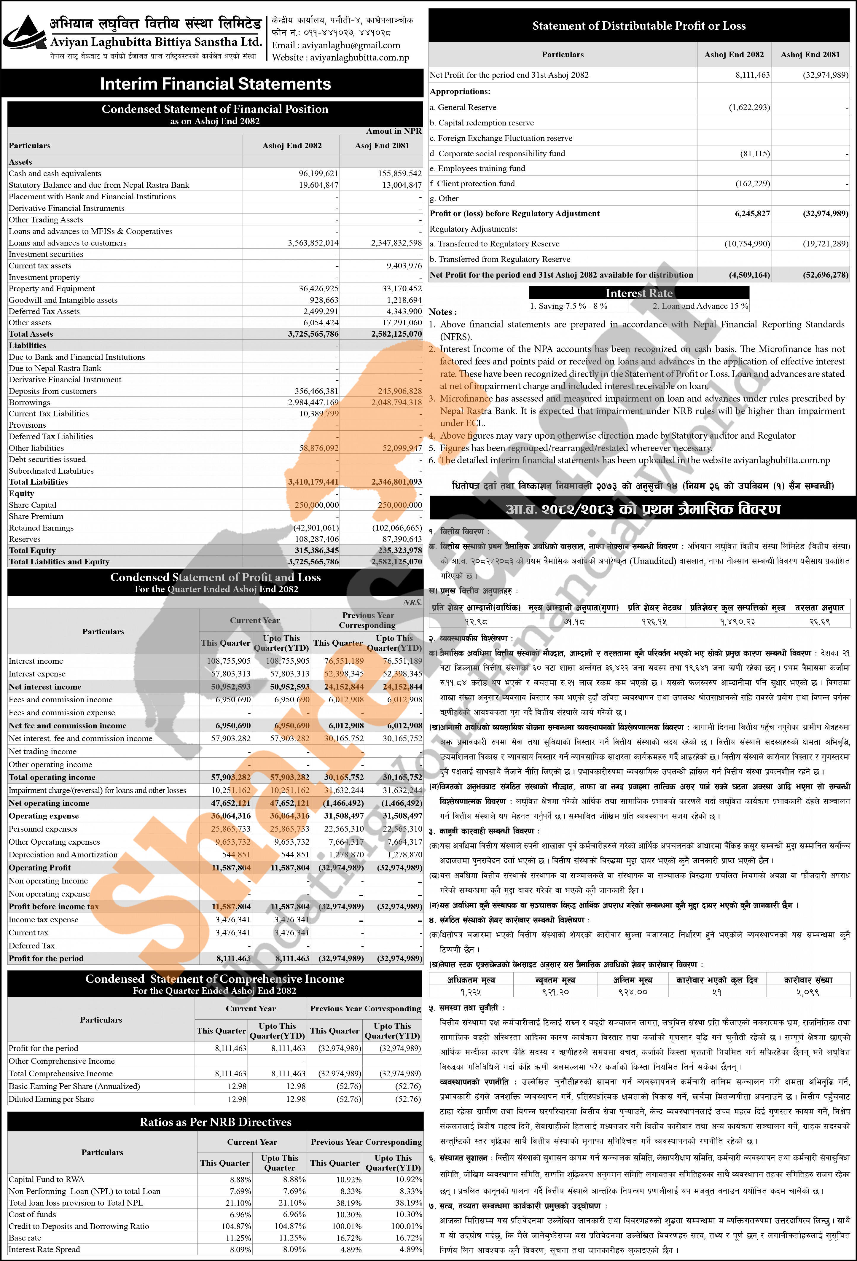 Aviyan Laghubitta Bittiya Sanstha Limited has posted a net profit of Rs 8.11 million and published its 1st quarter company analysis of the fiscal year 2082/83.