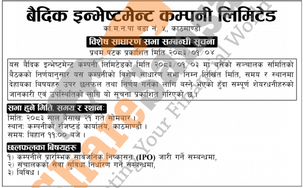 Baidik Investment Company Limited has announced its SGM going to be held on 21st Baisakh, 2083.