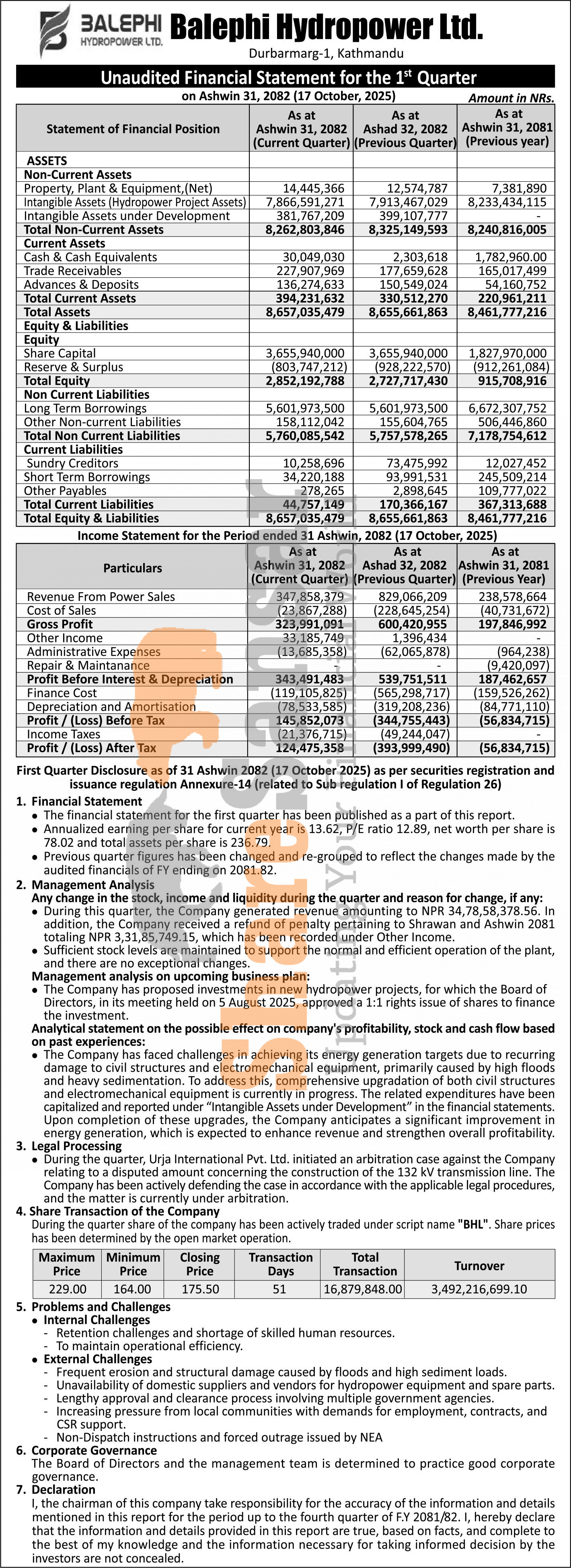 Balephi Hydropower Limited has posted a net profit of Rs 124.47 million and published its 1st quarter company analysis of the fiscal year 2082/83.