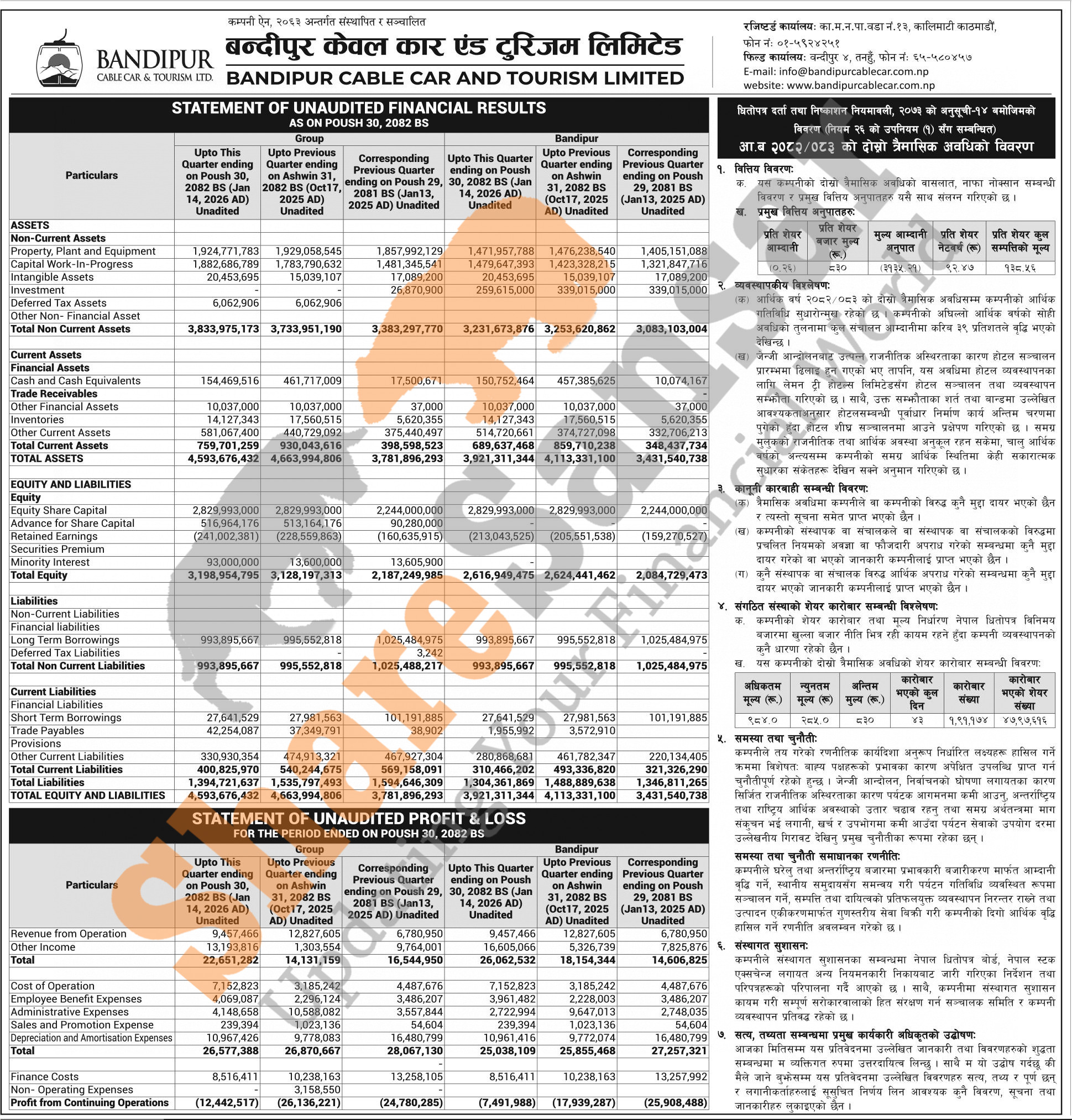 Bandipur Cable Car and Tourism Limited has posted a net loss of Rs 7.49 million and published its 2nd quarter company analysis of the fiscal year 2082/83.