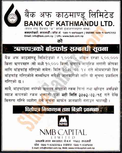 Bank of Kathmandu Limited has allotted Rs. 600 million Redeemable "8% BOK Debenture 2079" to the general public on 14th Ashad, 2072 and refunding money to the non-allottee investors from 18th Ashad, 2072.