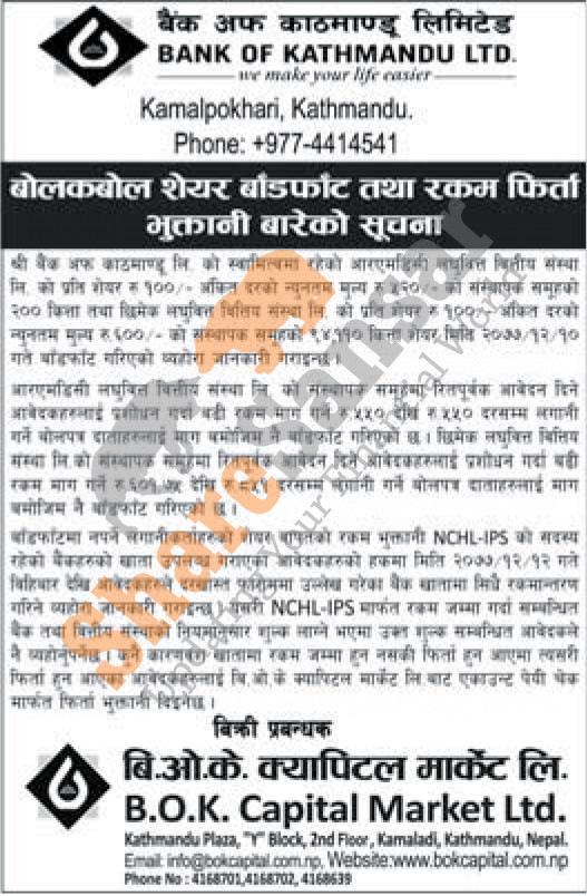 Bank of Kathmandu Limited has distributed 200 units promoter share of (RMDC Laghubitta Bittiya Sanstha Limited) and 94,110 units of promoter share of (Chhimek Laghubitta Bittiya Sanstha Limited) to the general public on 10th Chaitra, 2077 and refunding money to non allottee investors from 12th Chaitra, 2077.