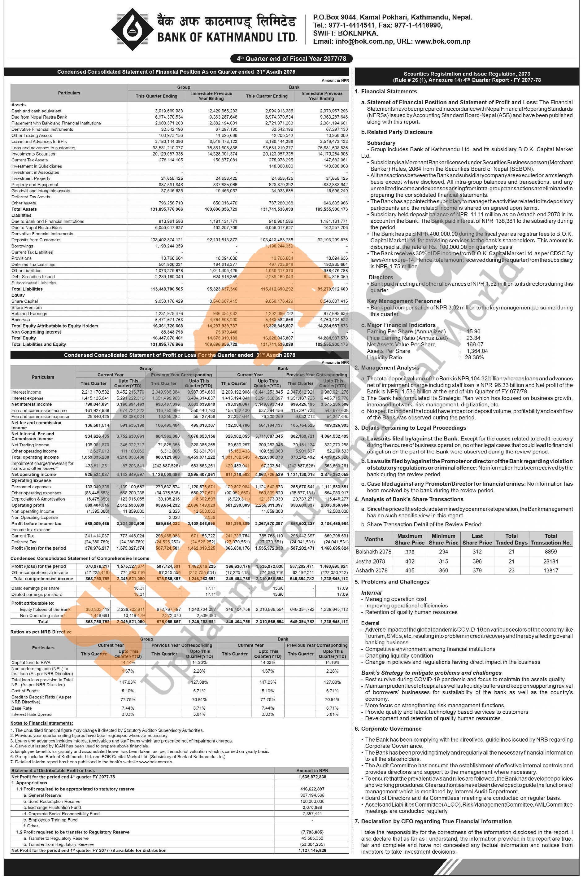Bank of Kathmandu Limited has posted a net profit of Rs 1.53 billion and published its 4th quarter company analysis of the fiscal year 2077/78.