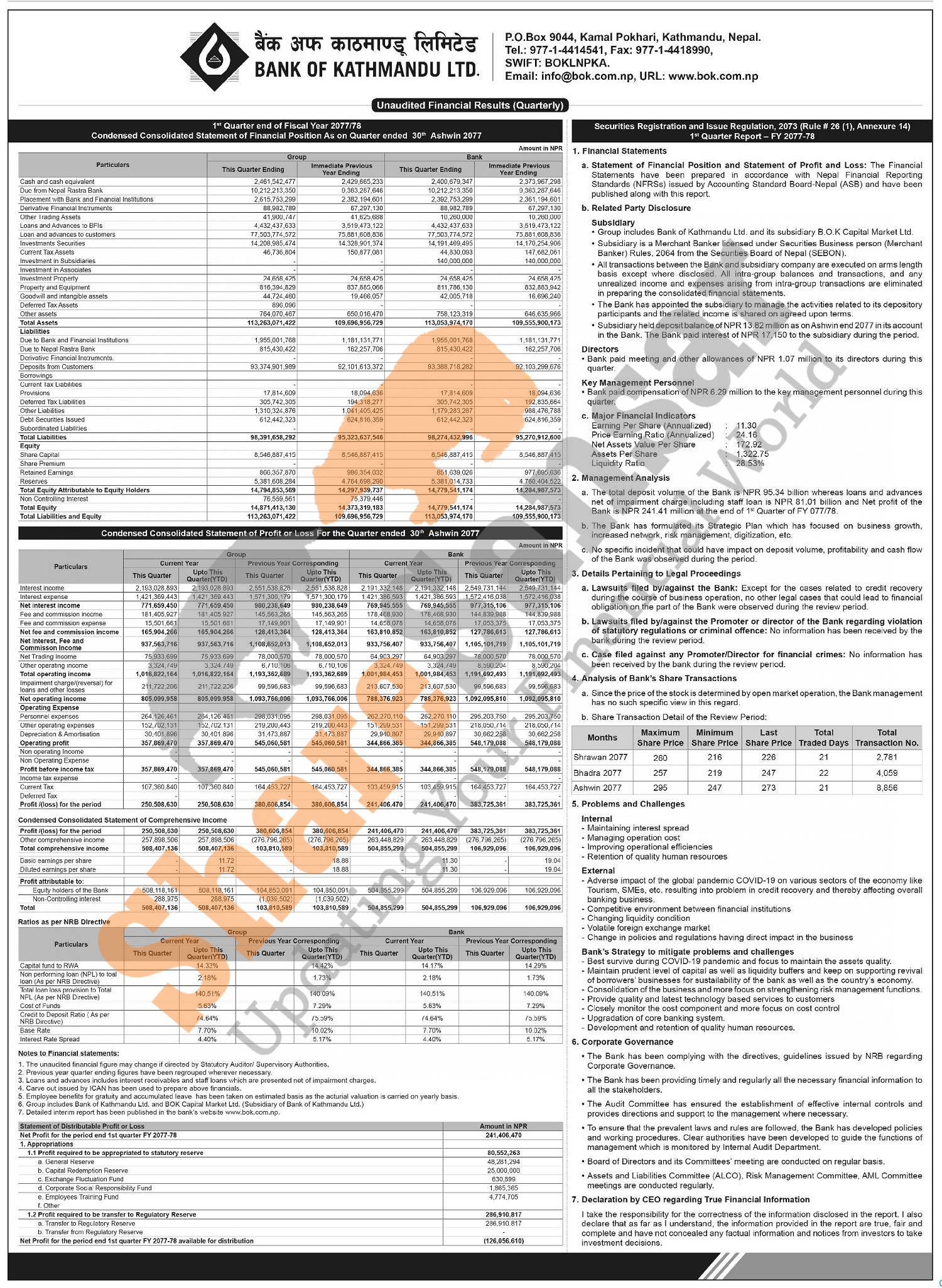 Bank of Kathmandu Limited has posted a net profit of Rs 241.40 million and published its 1st quarter company analysis of the fiscal year 2077/78.