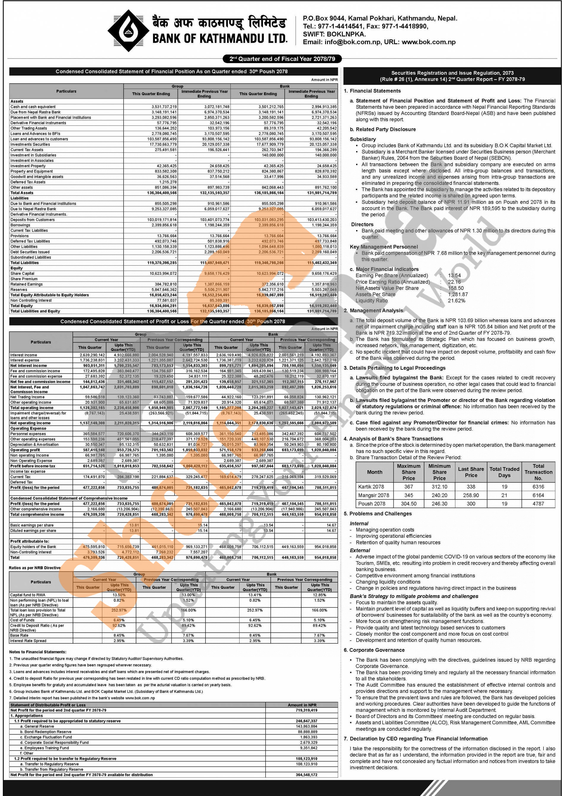 Bank of Kathmandu Limited has posted a net profit of Rs 719.31 million and published its 2nd quarter company analysis of the fiscal year 2078/79.