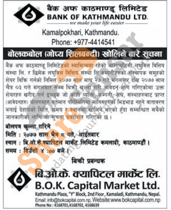 Bank of Kathmandu Limited has published a notice regarding bid opening of its 1,50,000 units promoter share of (RMDC Laghubitta Bittiya Sanstha Limited) and 7,00,000 units of promoter share of (Chhimek Laghubitta Bittiya Sanstha Limited) to the general public on 8th Chaitra, 2077.