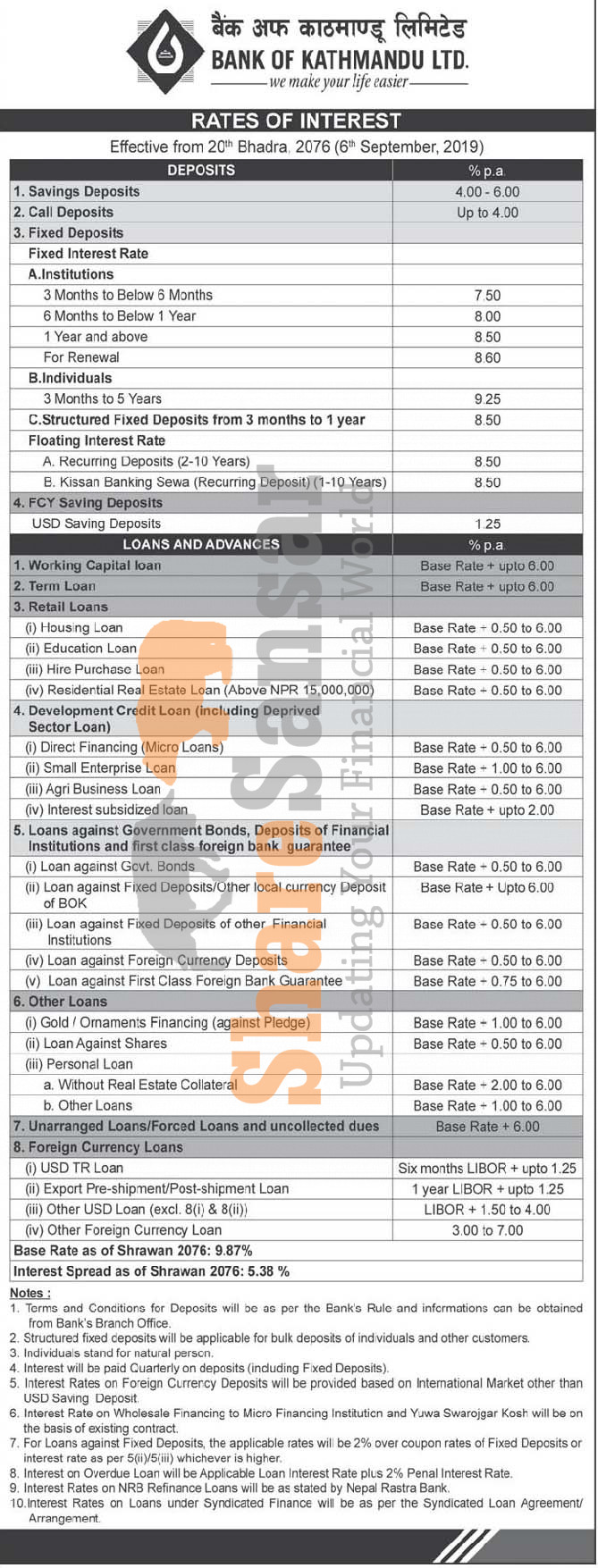 Bank of Kathmandu Limited has published a notice regarding new interest rate and its effective from 20th Bhadra, 2076.