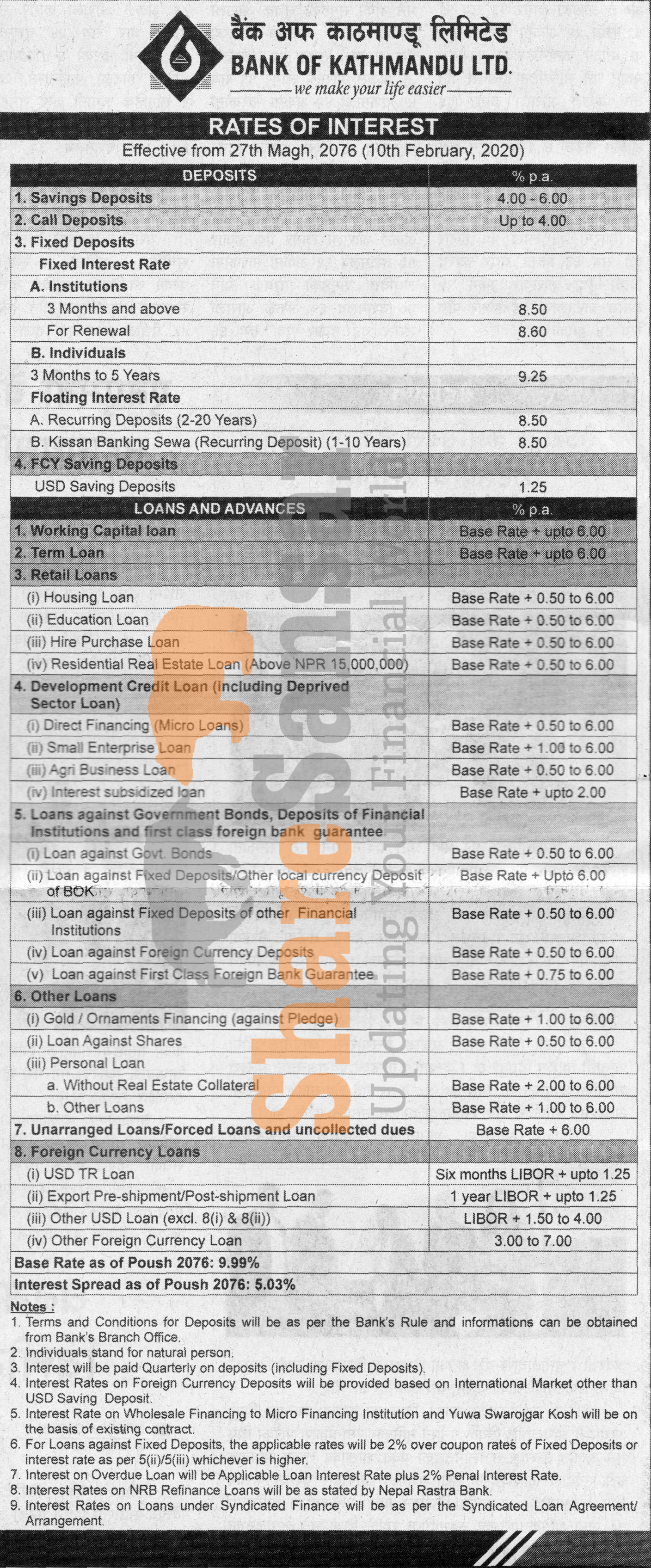 Bank of Kathmandu Limited has published a notice regarding new interest rate and its effective from 27th Magh, 2076.