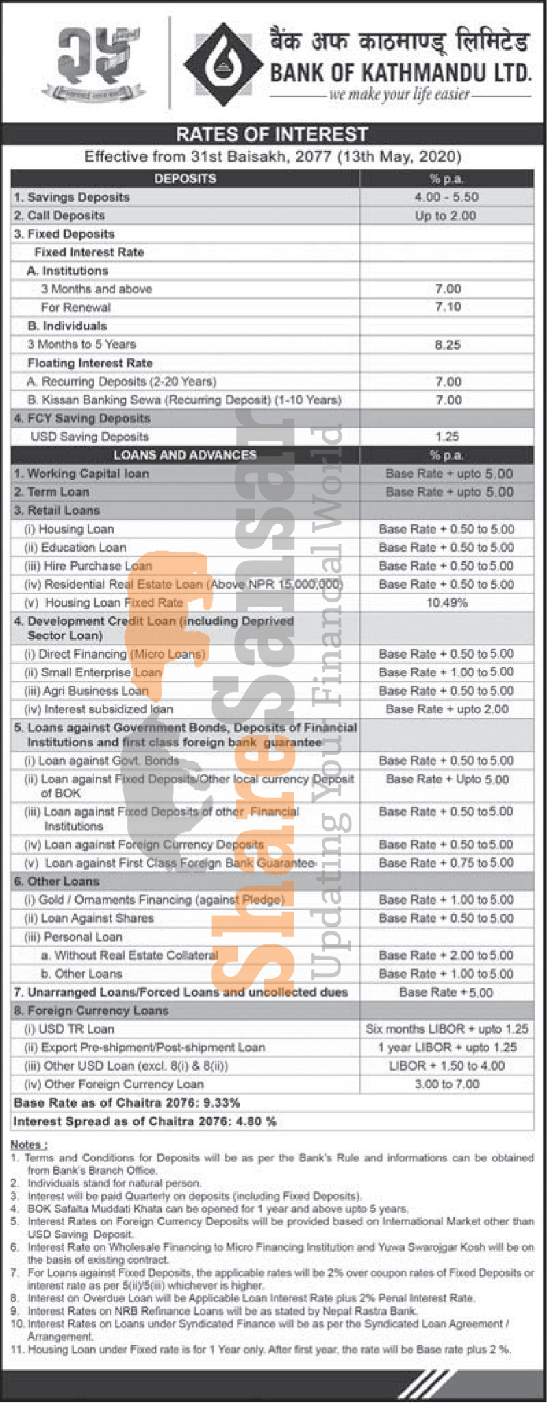 Bank of Kathmandu Limited has published a notice regarding new interest rate and its effective from 31st Baishakh, 2077.