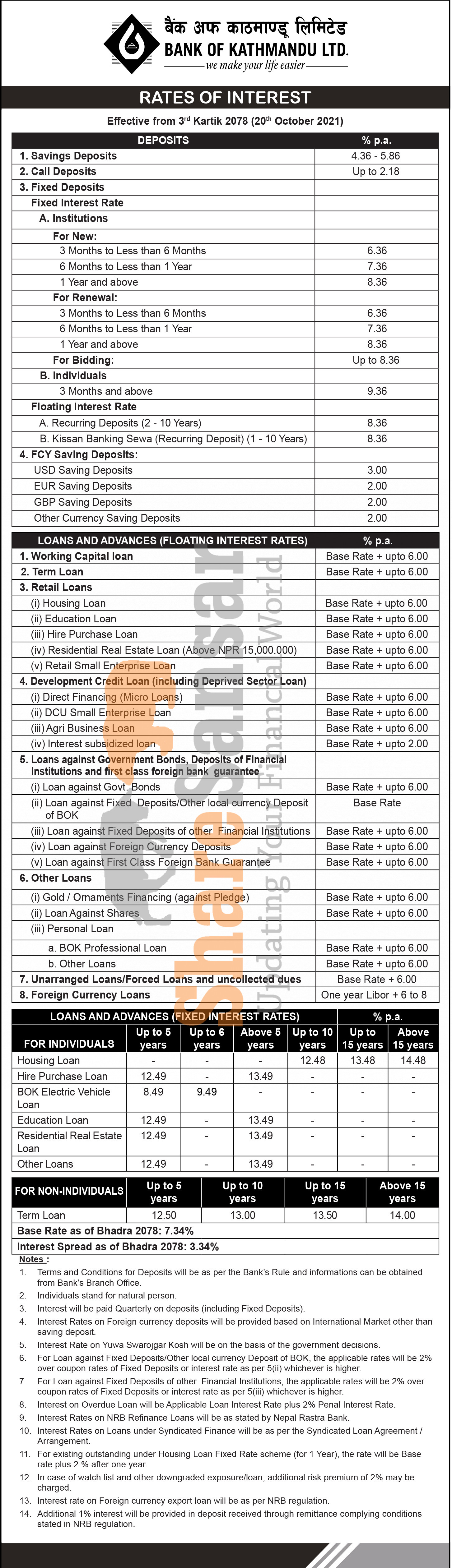 Bank of Kathmandu Limited has published a notice regarding new revised interest rate and it's effective from 3rd Kartik, 2078.