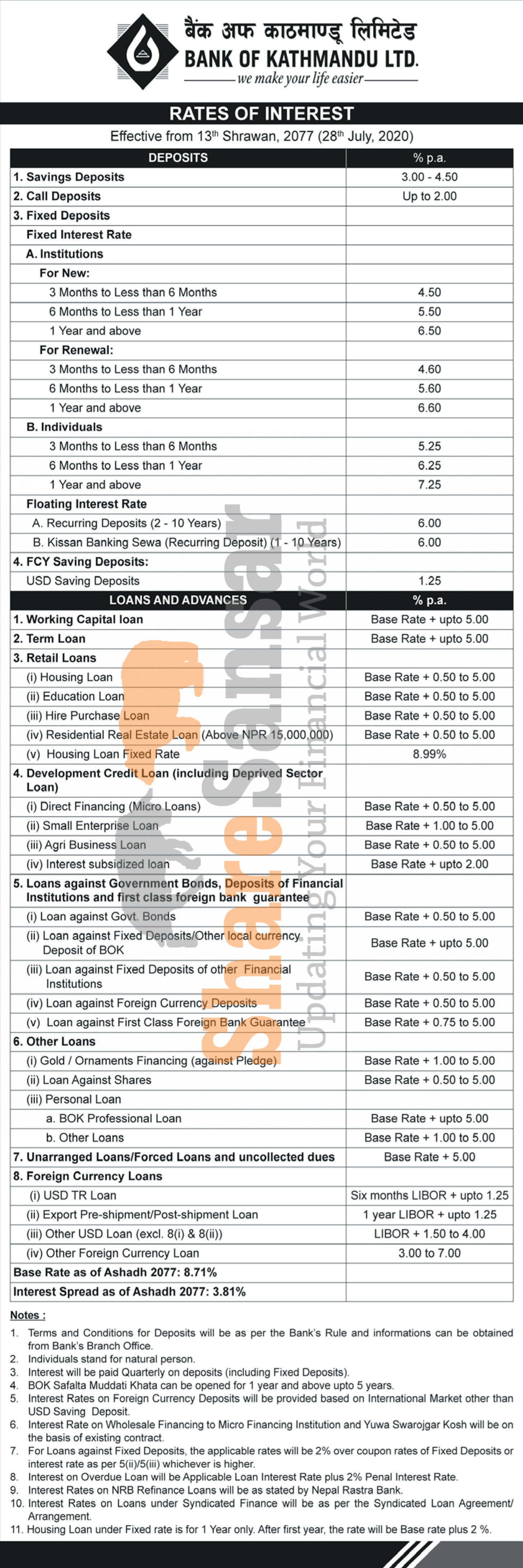 Bank of Kathmandu Limited has published a notice regarding the interest rate on the various deposit products and its effective from 13th Shrawan, 2077.