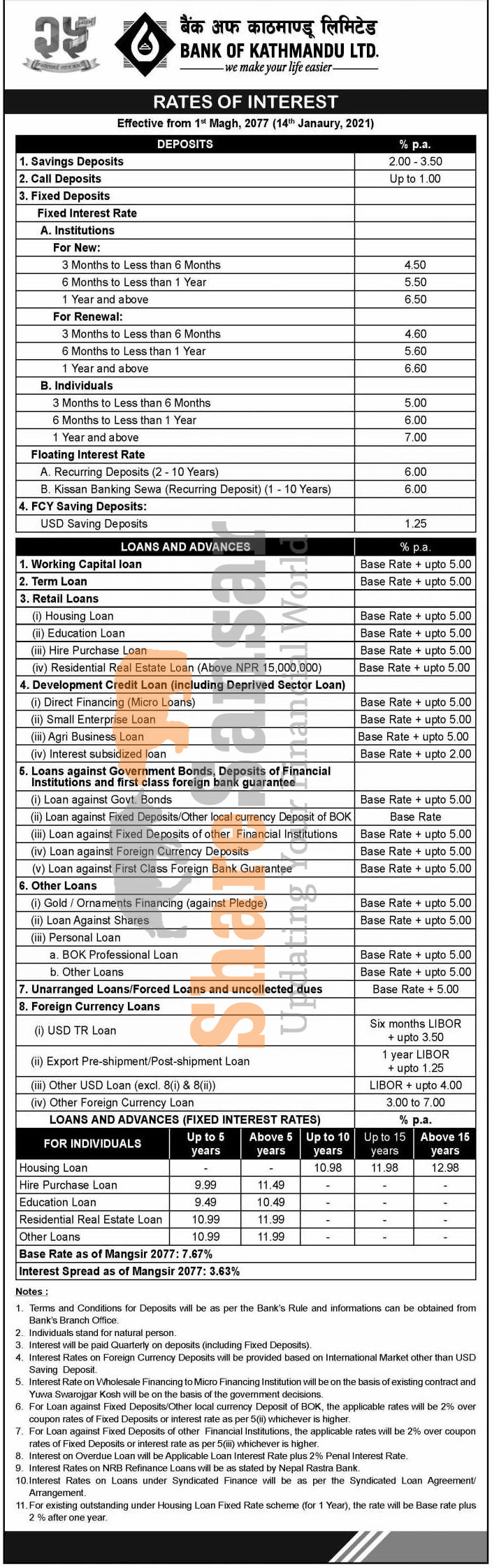 Bank of Kathmandu Limited has published a notice regarding the new interest rate for deposit and loan products and it's effective from 1st Magh, 2077.