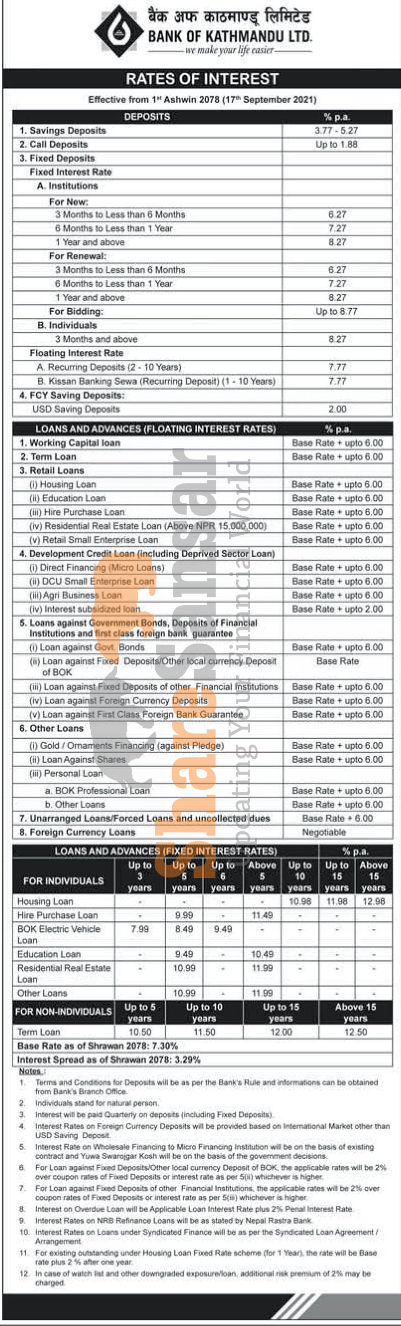 Bank of Kathmandu Limited has published a notice regarding the new interest rate for its deposit and loan products and it's effective from 1st Ashwin, 2078.