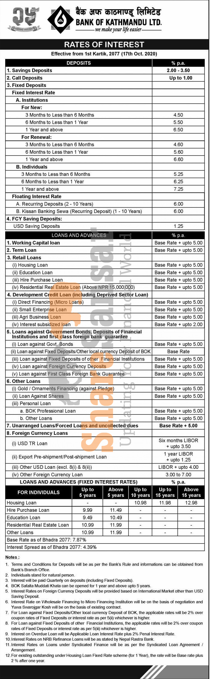 Bank of Kathmandu Limited has published a notice regarding the new interest rate for its loan and deposit products and it's effective from 1st Kartik, 2077.