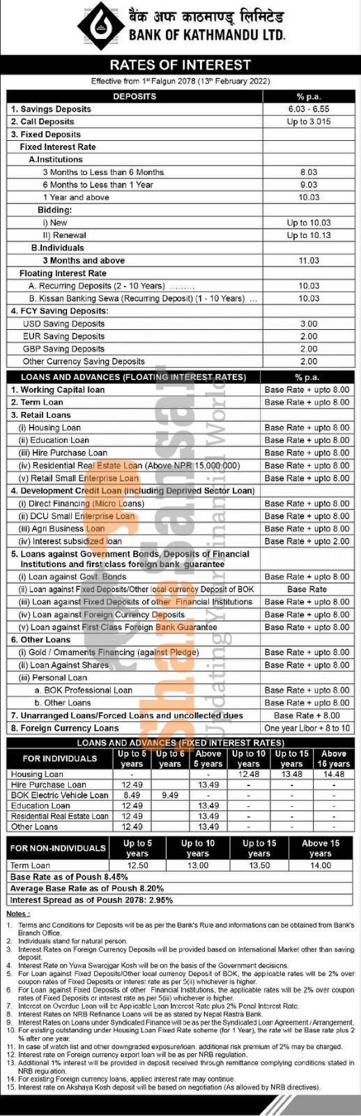 Bank of Kathmandu Limited has published a notice regarding the new interest rate on its deposit and loan products and it's effective from 1st Falgun, 2078.
