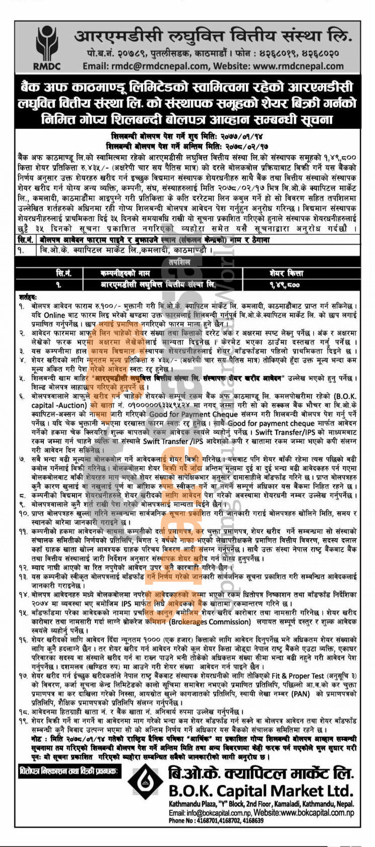 Bank of Kathmandu Limited has published notice regarding amendment of last tender date and auction of 1,49,800 units promoter share of RMDC Laghubitta Bittiya Sanstha Limited to general public as 17th Jestha, 2078.