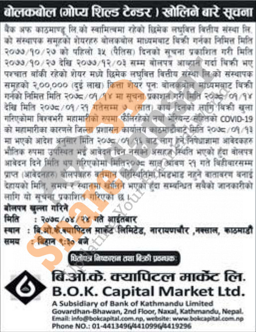 Bank of Kathmandu Limited has published notice regarding bid opening day of 2,00,000 units of promoter share of Chhimek Laghubitta Bittiya Sanstha Limited on 24th Shrawan, 2078.