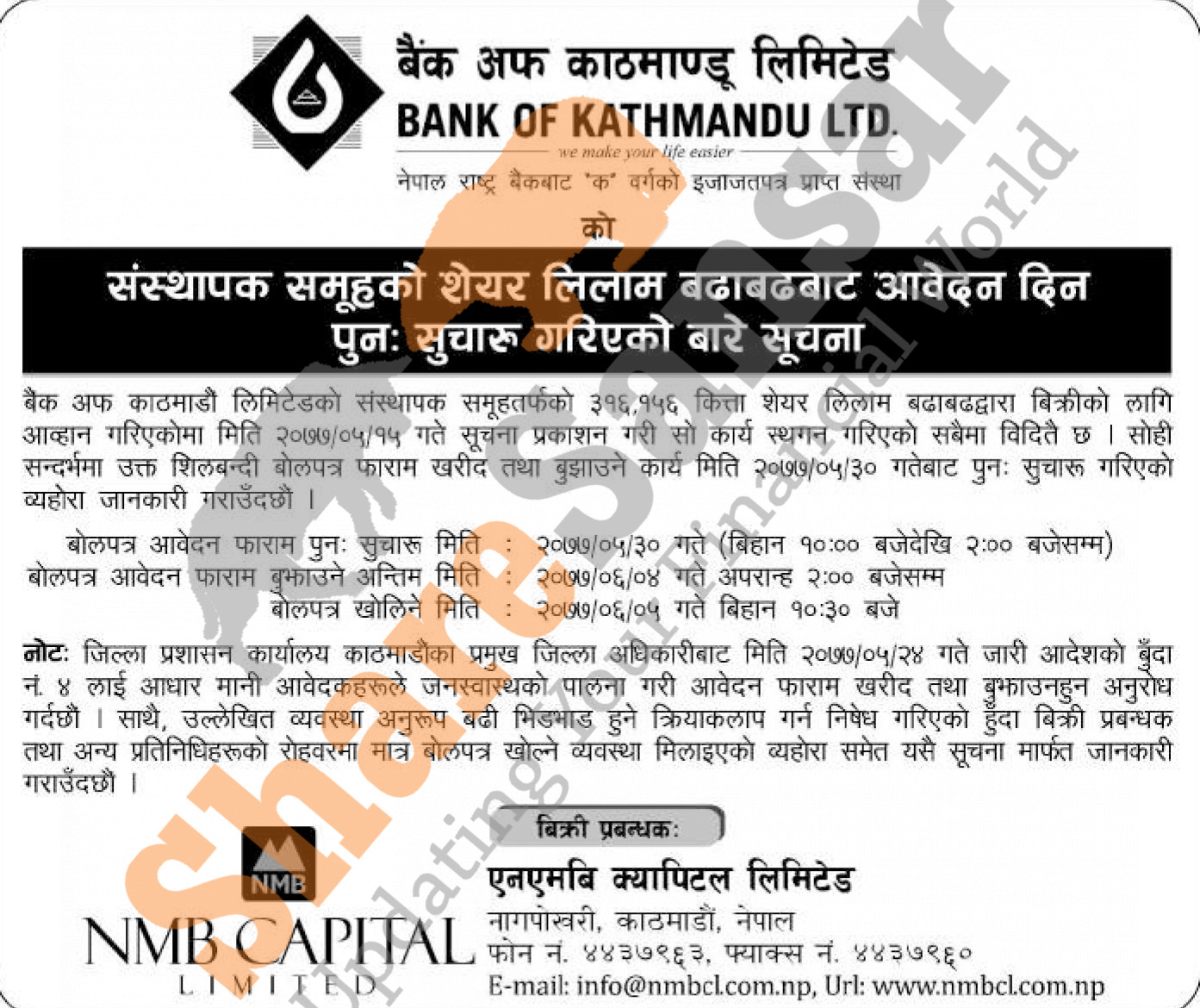 Bank of Kathmandu Limited published a notice regarding resumption of auction application from today (30th Bhadra, 2077).