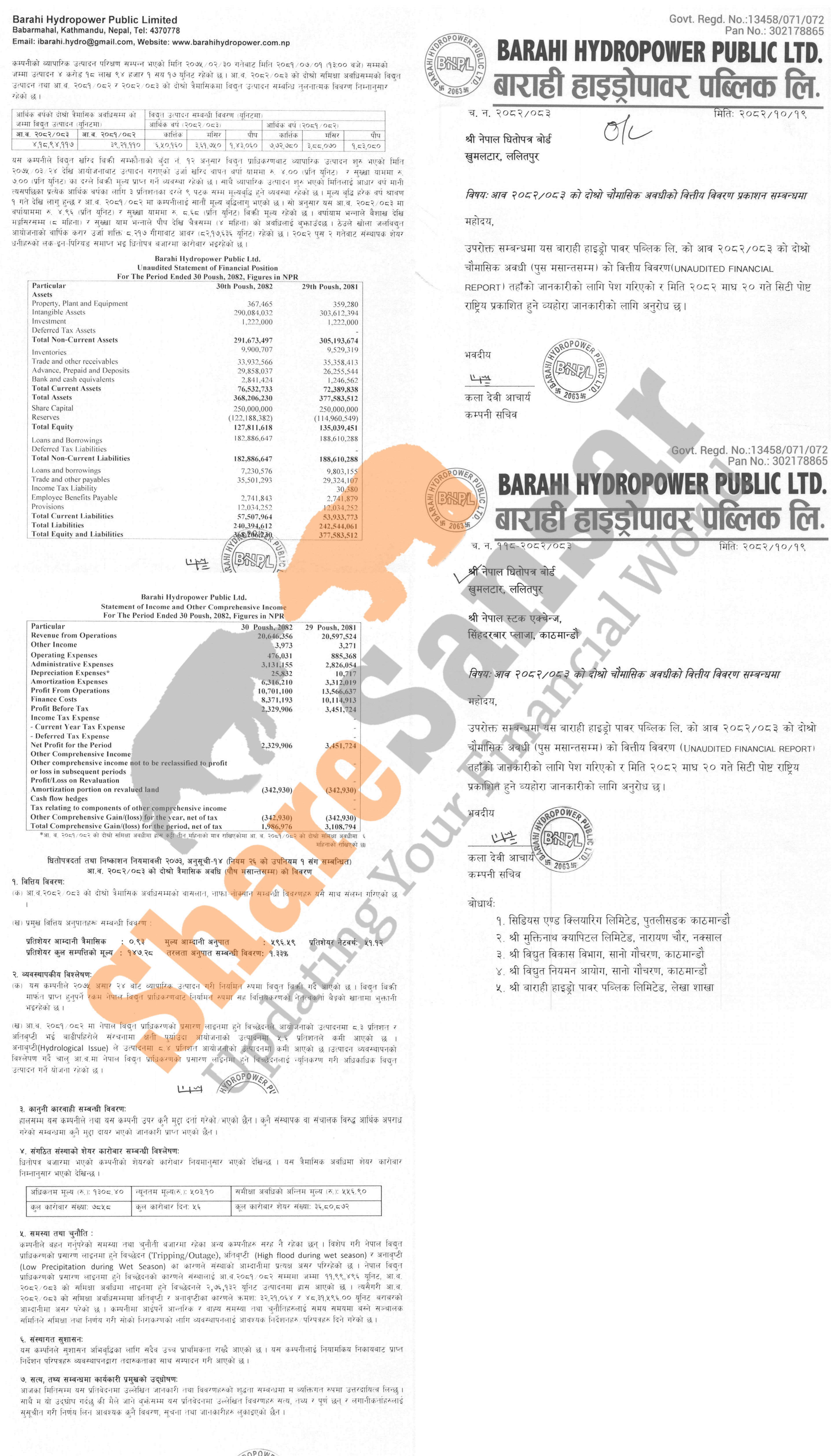 Barahi Hydropower Public Limited has posted a net profit of Rs 2.32 million and published its 2nd quarter company analysis of the fiscal year 2082/83.