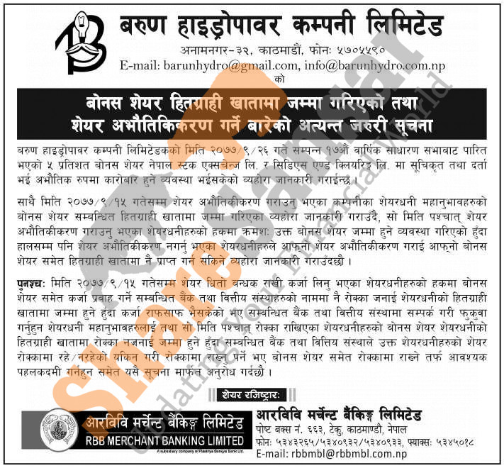 Barun Hydropower Company Limited has distributed 5% bonus shares directly to DEMAT accounts of its shareholders and has urged to dematerialize their shares.