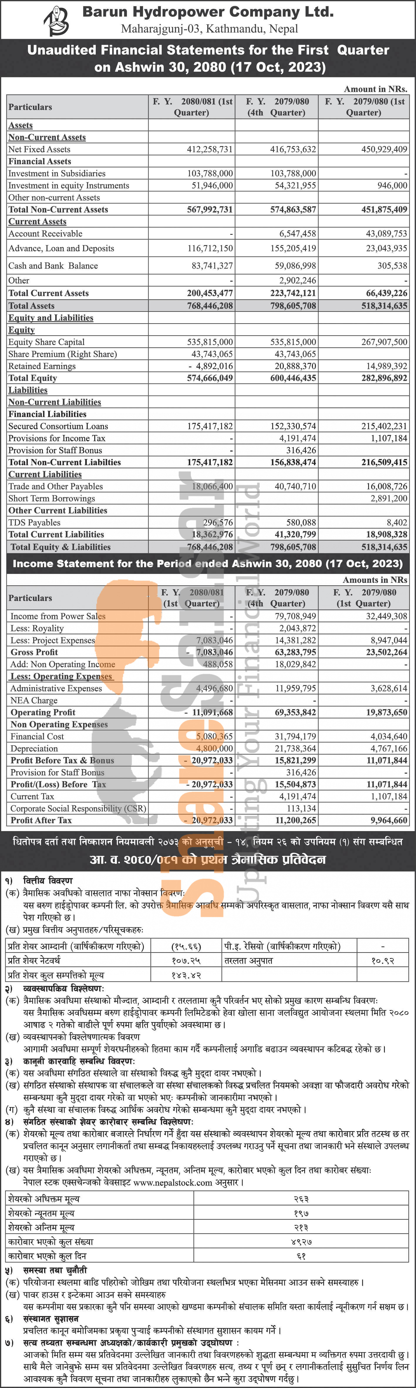 Barun Hydropower Company Limited has posted a net loss of Rs 20.97 million and published its 1st quarter company analysis of the fiscal year 2080/81.