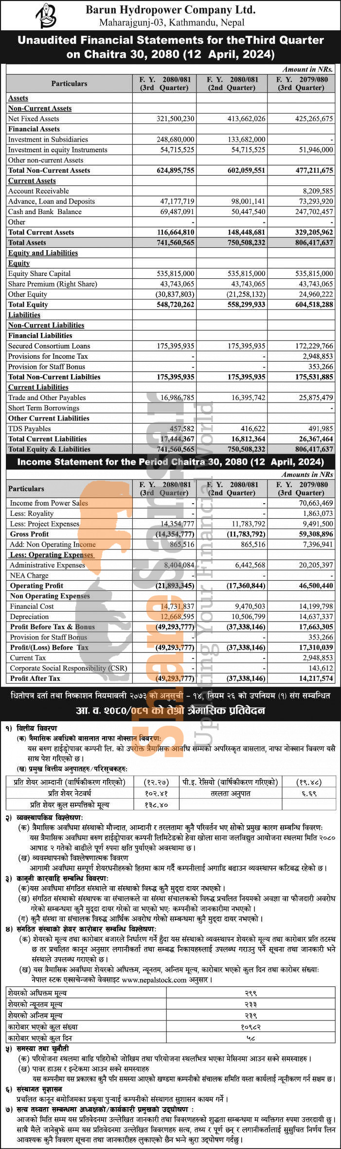 Barun Hydropower Company Limited has posted a net loss of Rs 49.29 million and published its 3rd quarter company analysis of the fiscal year 2080/81.