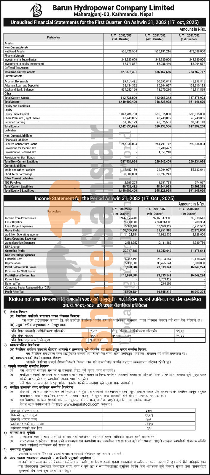 Barun Hydropower Company Limited has posted a net profit of Rs 18.99 million and published its 1st quarter company analysis of the fiscal year 2082/83.