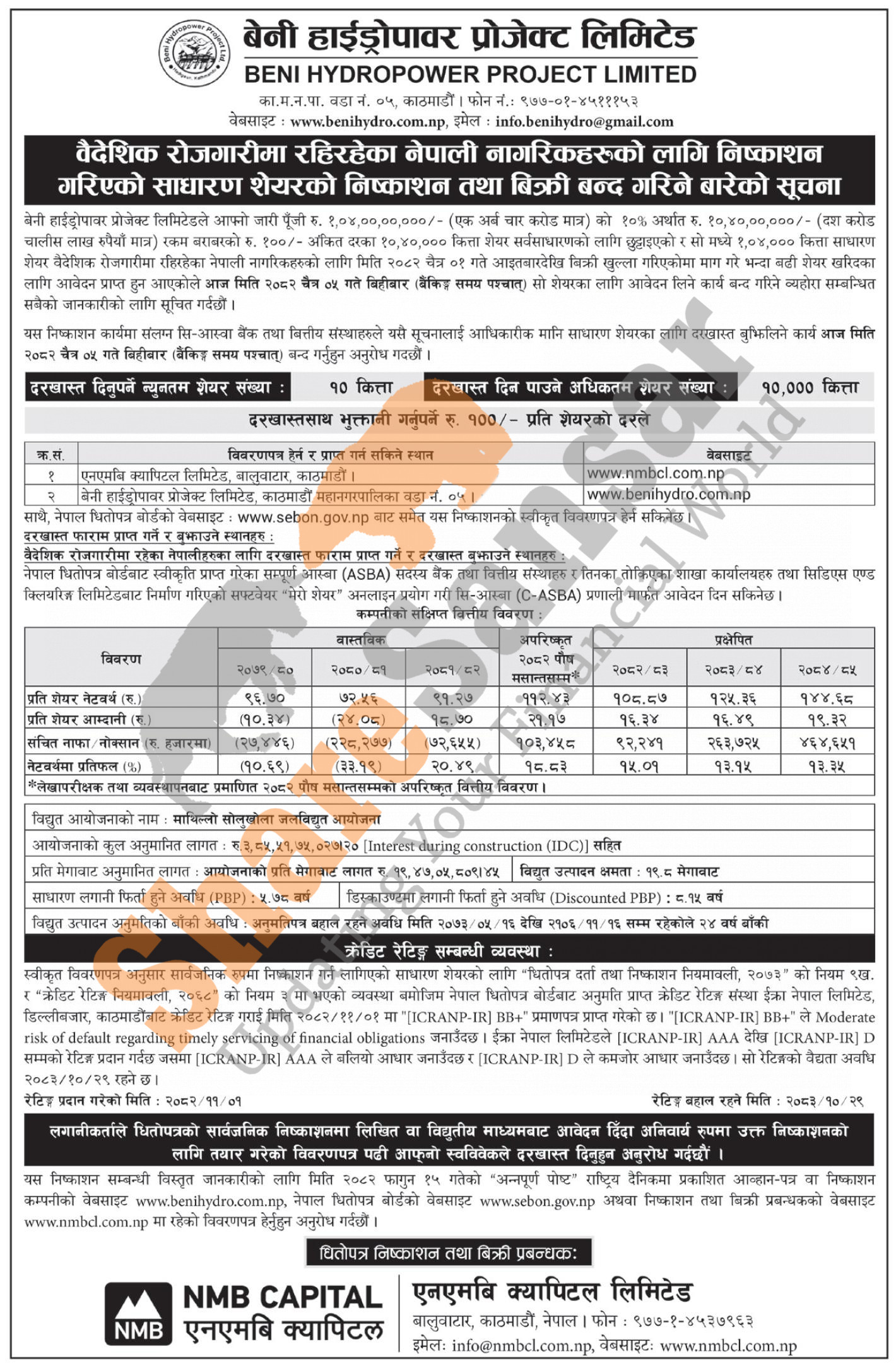 Beni Hydropower Project Limited is closing its 1,04,000 units IPO Shares to Foreign Nepalese Employees from today (5th Chaitra, 2082).