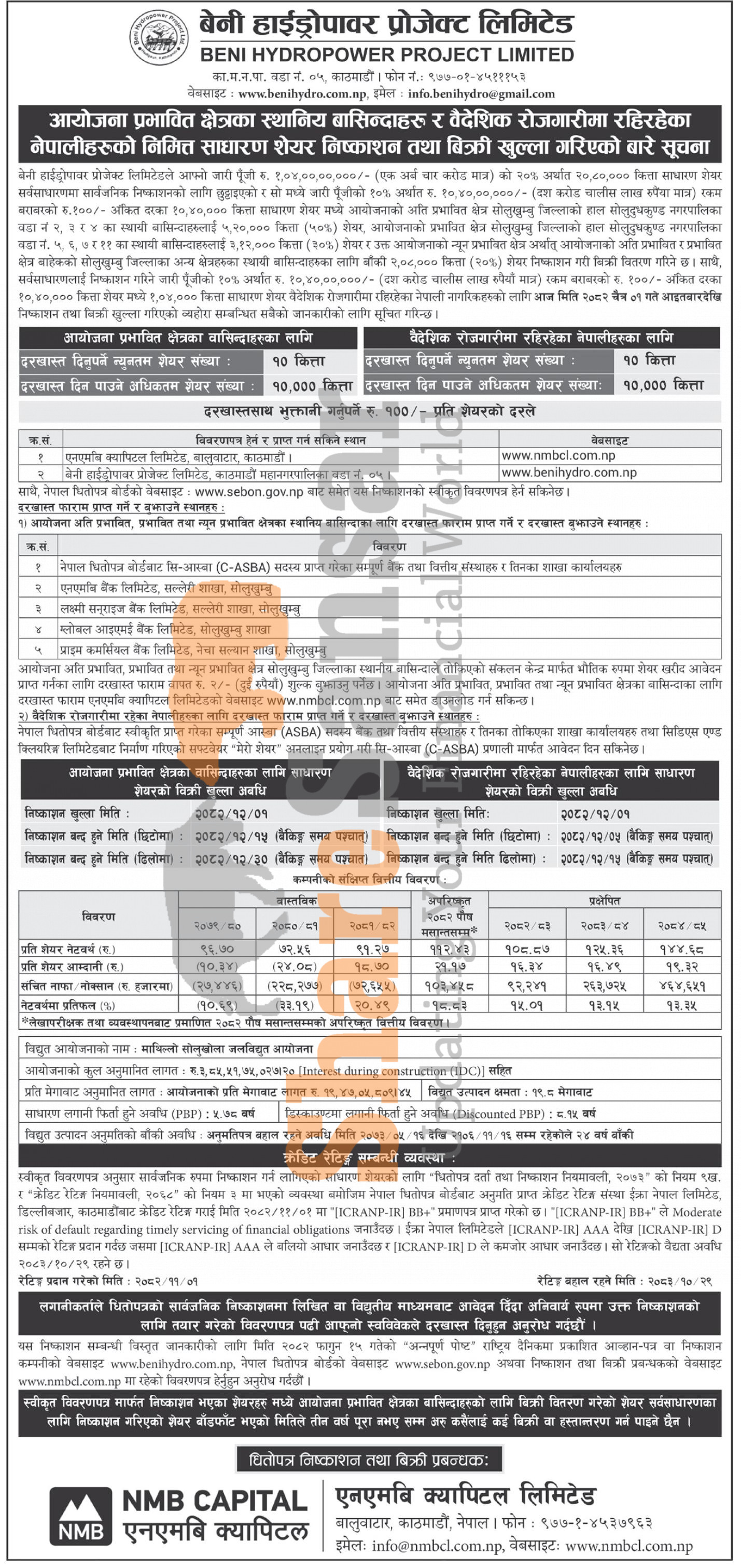 Beni Hydropower Project Limited is opening its 10,40,000 units IPO shares to the project-affected locals of Solukhumbhu District and 1,04,000 units IPO Shares to Foreign Nepalese Employees from today (1st Chaitra, 2082).