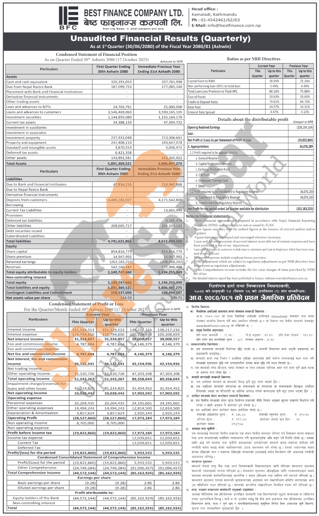 Best Finance Company Limited has posted a net loss of Rs 19.82 million and published its 1st quarter company analysis of the fiscal year 2080/81.