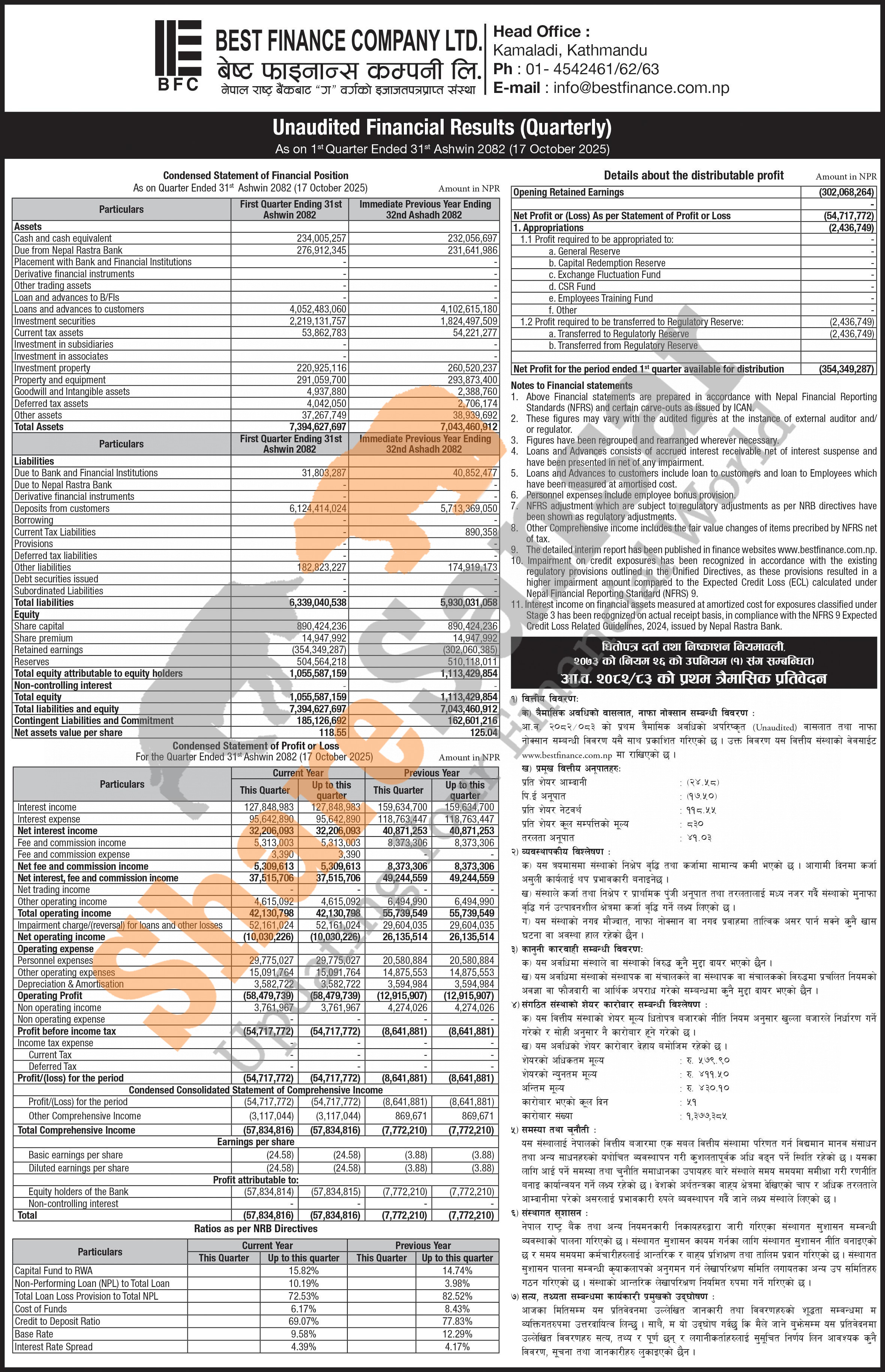 Best Finance Company Limited has posted a net loss of Rs 54.71 million and published its 1st quarter company analysis of the fiscal year 2082/83.