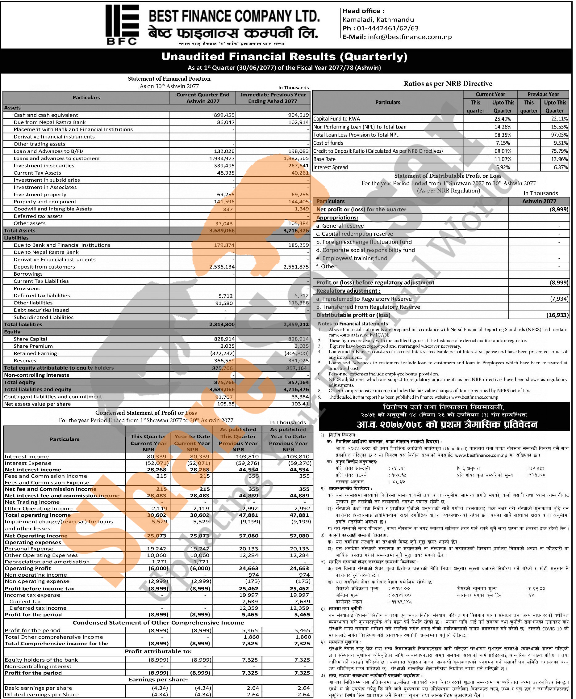 Best Finance Company Limited has posted a net loss of Rs 8.99 million and published its 1st quarter company analysis of the fiscal year 2077/78.