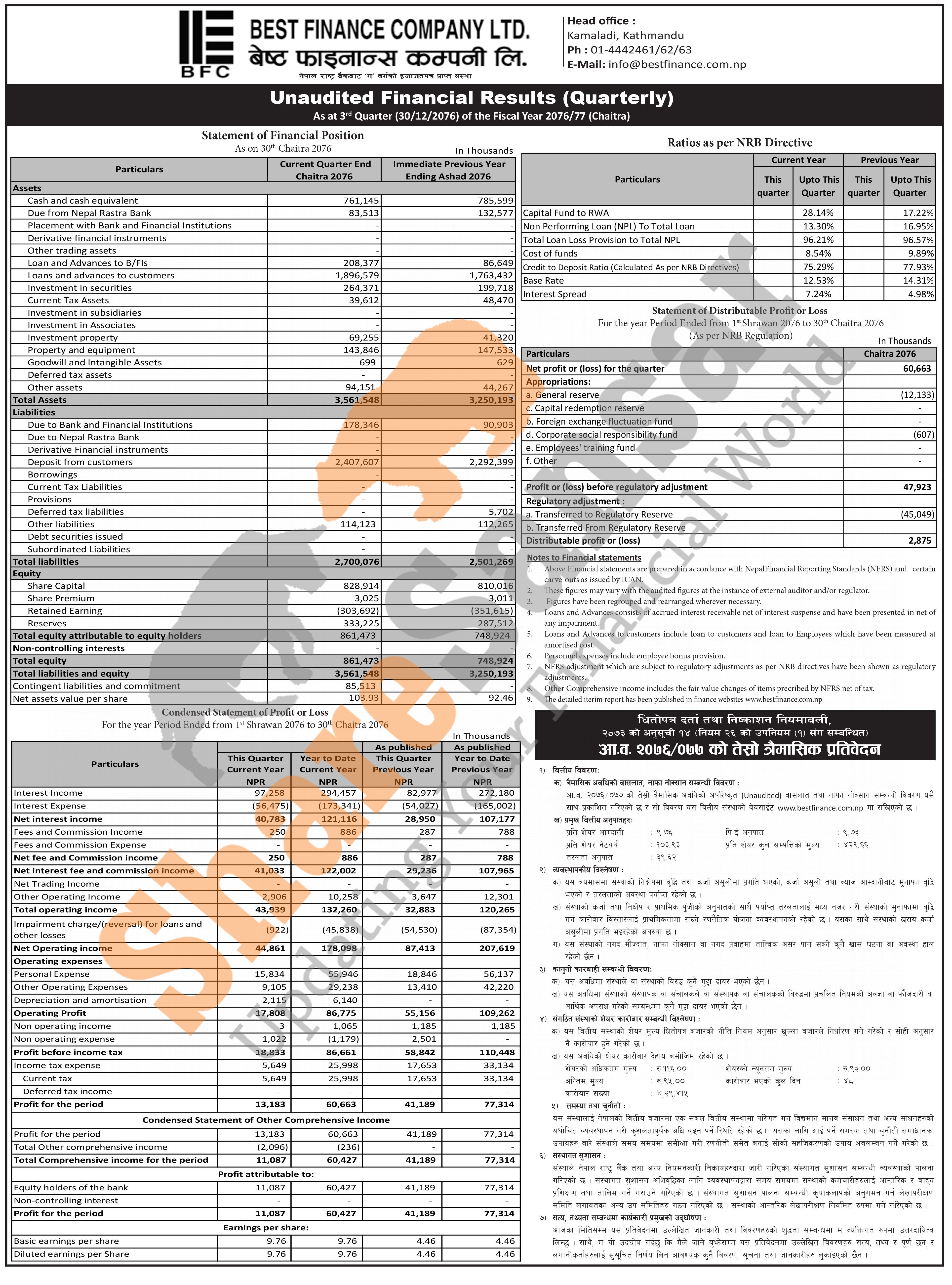 Best Finance Company Limited has posted a net profit of Rs 60.66 million and published its 3rd quarter company analysis of the fiscal year 2076/77.