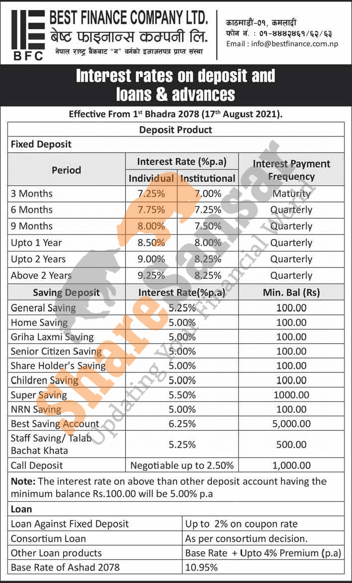 Best Finance Company Limited has published a notice regarding the new interest rate for deposit and loan products and it's effective from 1st Bhadra, 2078.