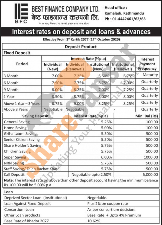 Best Finance Company Limited has published a notice regarding the new interest rate for its loan and deposit products and it's effective from 1st Kartik, 2077.