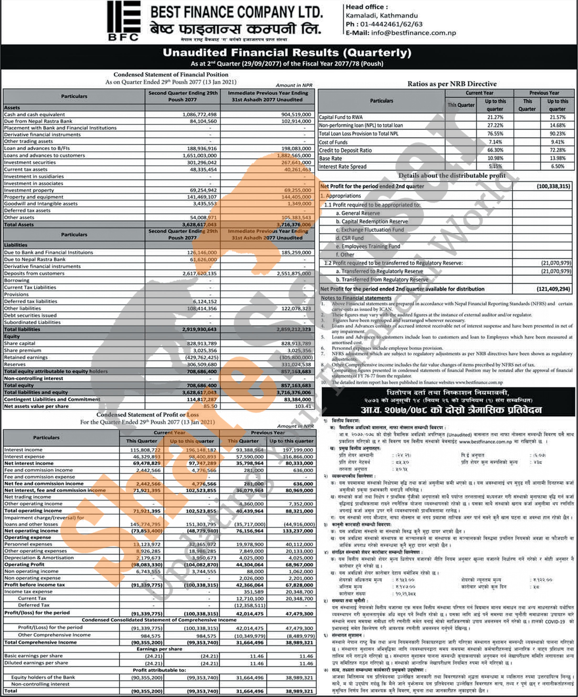Best Finance Limited has posted a net loss of Rs 100.33 million and published its 2nd quarter company analysis of the fiscal year 2077/78.