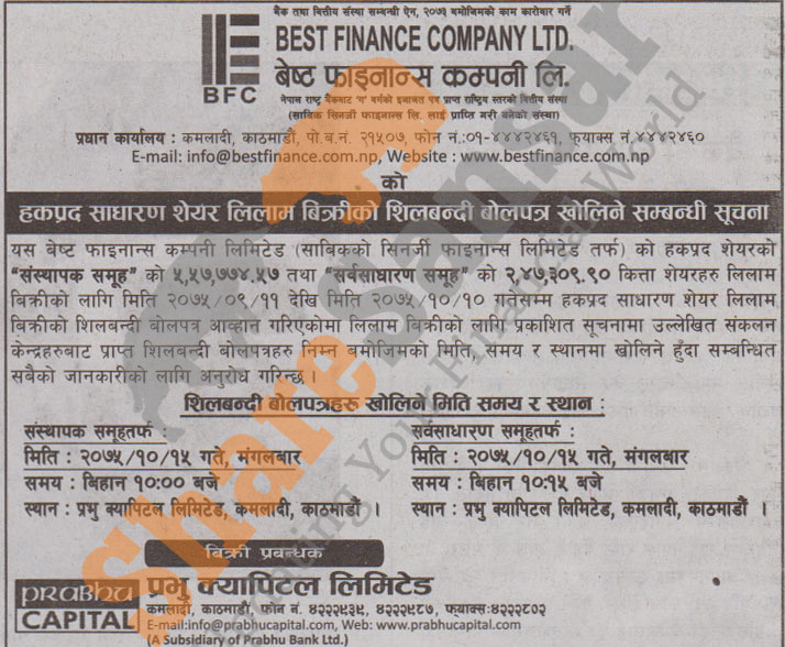 Best Finance Limited has published a notice regarding bid opening date of 5,57,774.57 unit promoter shares and 2,47,309.90 Ordinary share in auction to the general public on today (15th Magh, 2075).