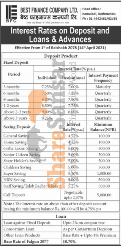 Best Finance Limited has published a notice regarding the new interest rate for deposit and loan products and it's effective from 1st Baisakh, 2078.