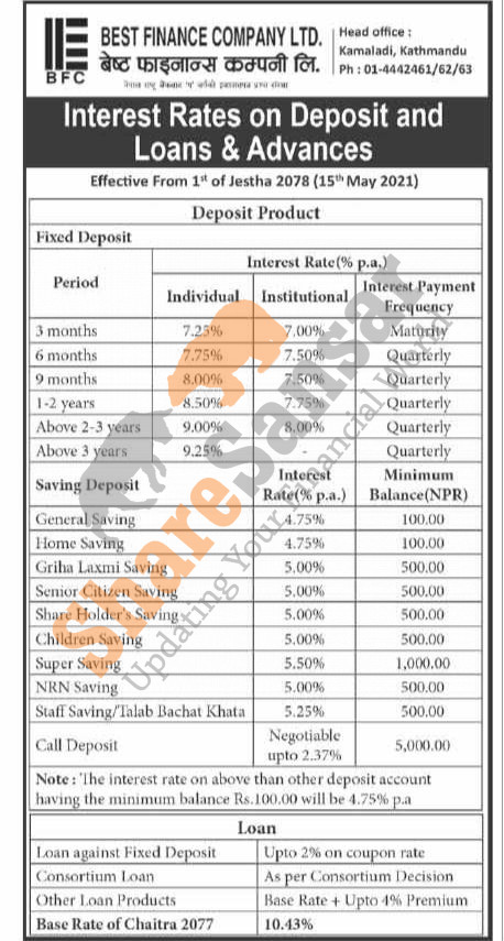 Best Finance Limited has published a notice regarding the new interest rate for deposit and loan products and it's effective from 1st Jestha, 2078.